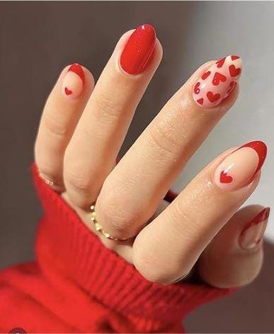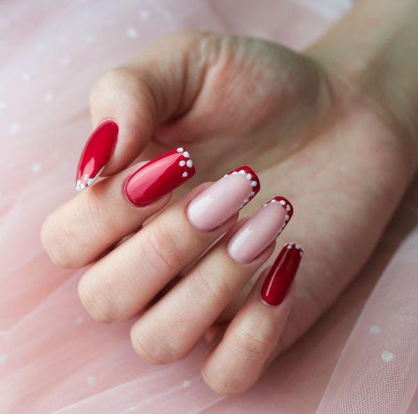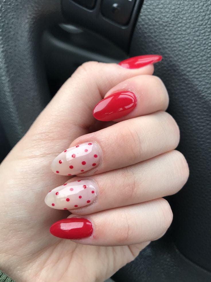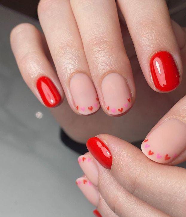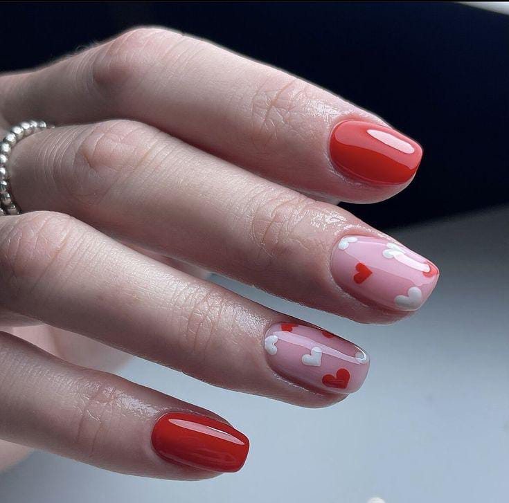 A mix of red and blush nails is finished with subtle dotted accents near the tips. It is simple, elegant, and adds a playful Valentine touch without being too bold.