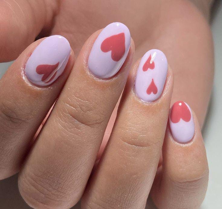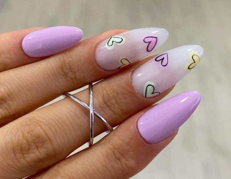 Lavender almond nails are accented with light pastel hearts for a soft Valentine vibe. The design feels airy, minimal, and gently playful.