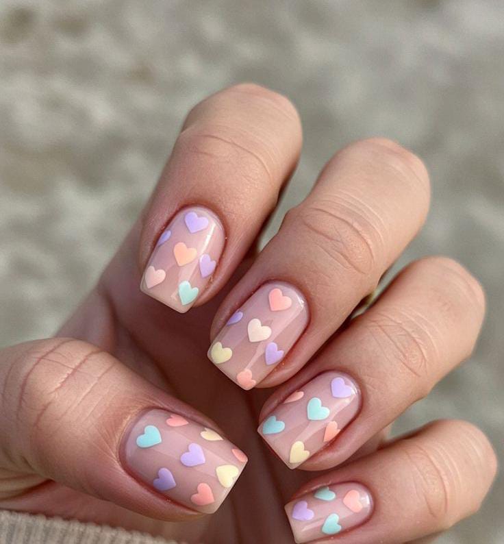A sheer nude base is decorated with small pastel hearts scattered evenly. It looks delicate, fresh, and perfect for a soft minimal Valentine aesthetic.