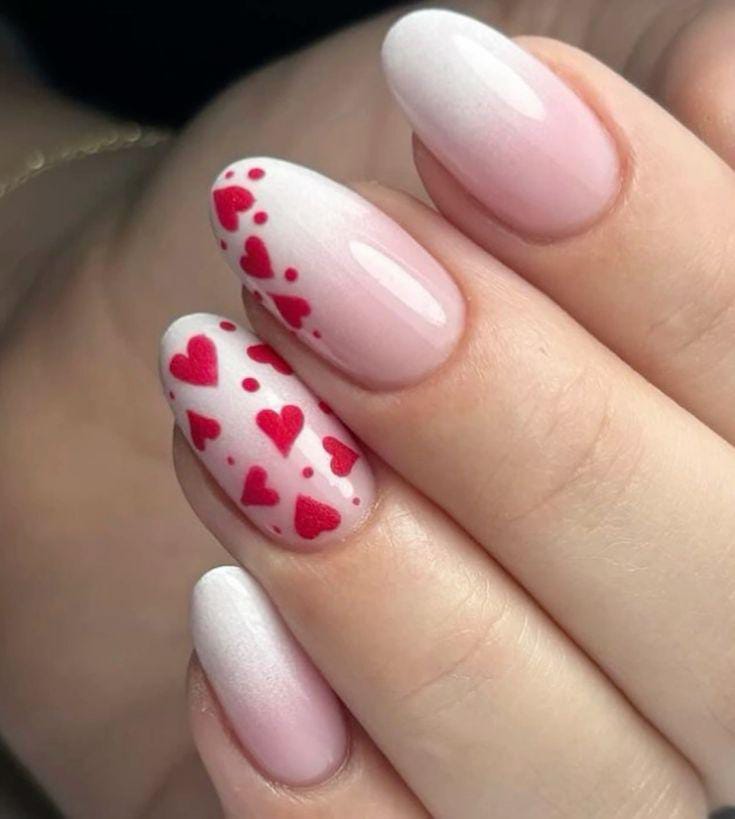 These nails feature a gentle pink-to-white ombré with scattered tiny red hearts for a sweet, romantic feel. The look is soft, airy, and perfect for a minimal Valentine vibe.