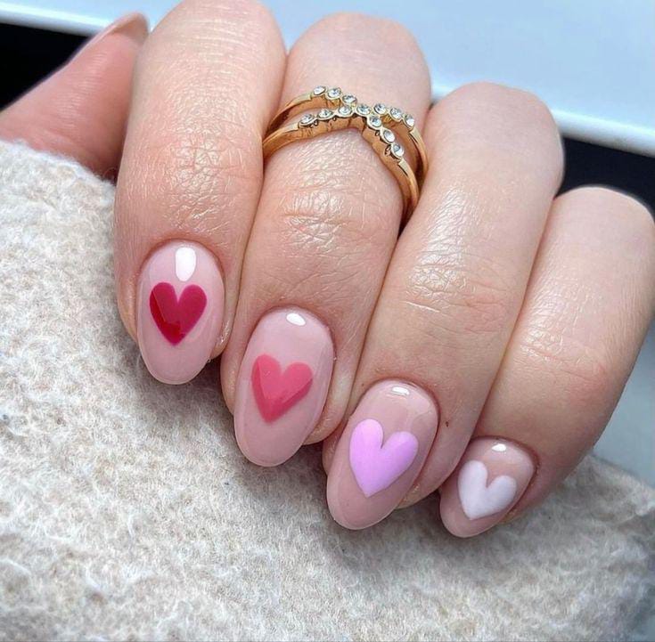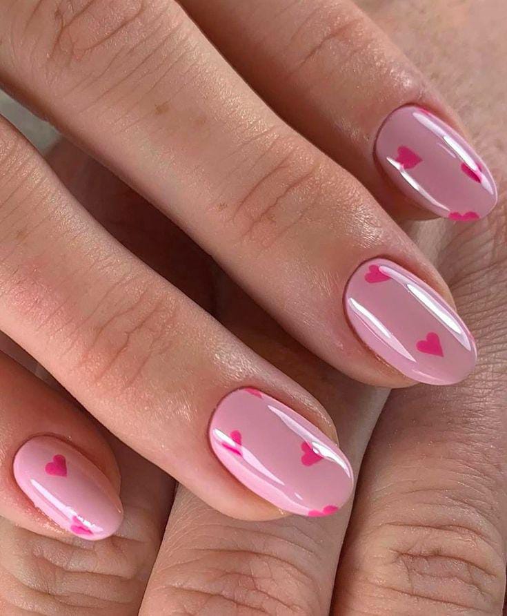 A nude pink base is paired with simple heart accents in different soft shades, creating a playful but polished style. It feels minimal, cute, and effortlessly romantic Valentines.