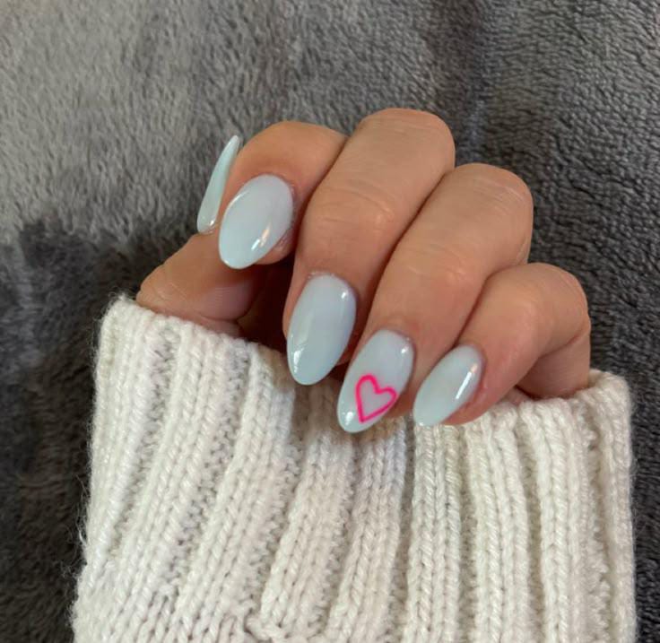 Cool baby blue nails are kept minimal with a single outlined pink heart accent. The overall Valentine’s vibe is fresh, cozy, and subtly romantic.