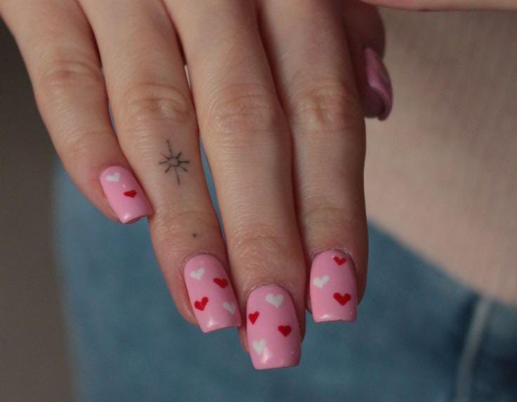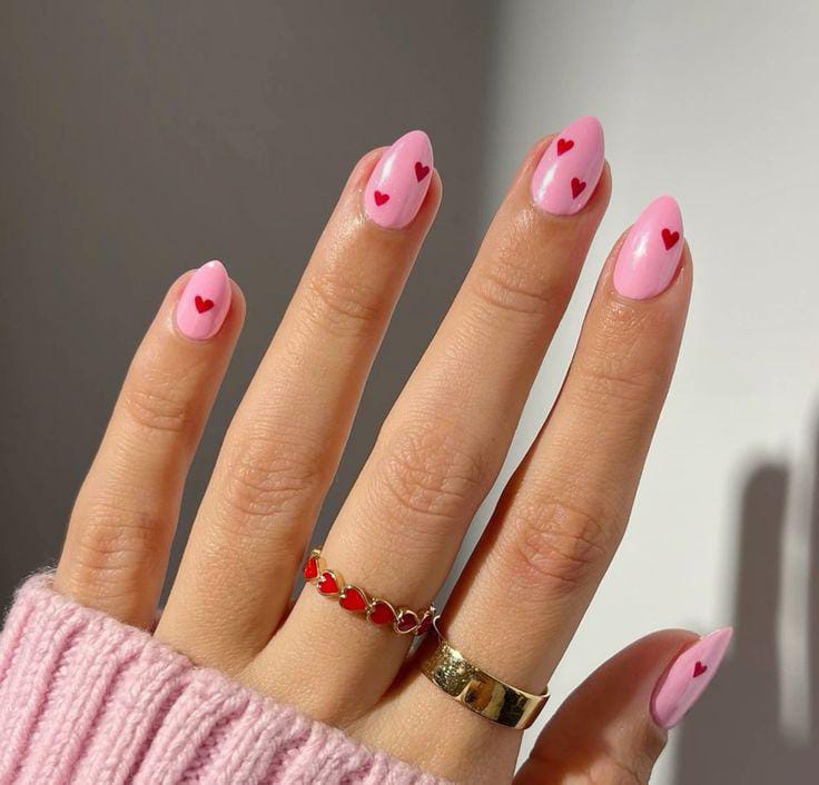 A light pink base with tiny red and white hearts scattered across the nails. The look feels sweet, playful, and effortlessly romantic Valentines.