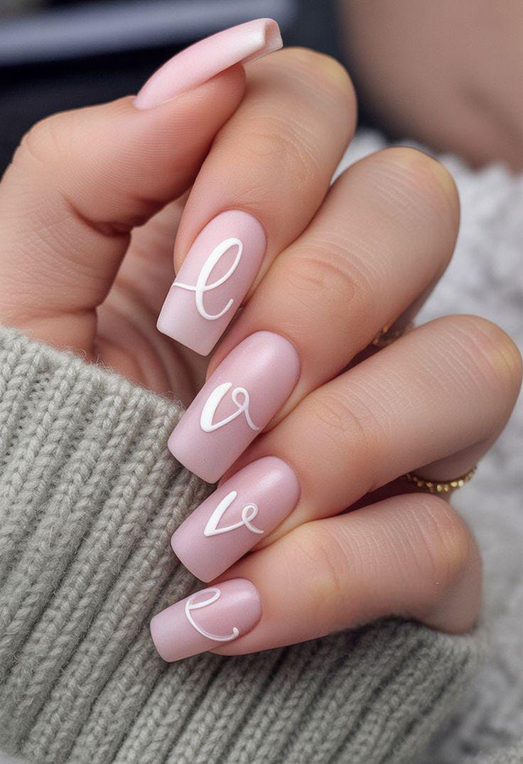Soft blush pink nails are decorated with delicate white lettering spelling love. The style is minimal, cozy, and quietly romantic Valentines.