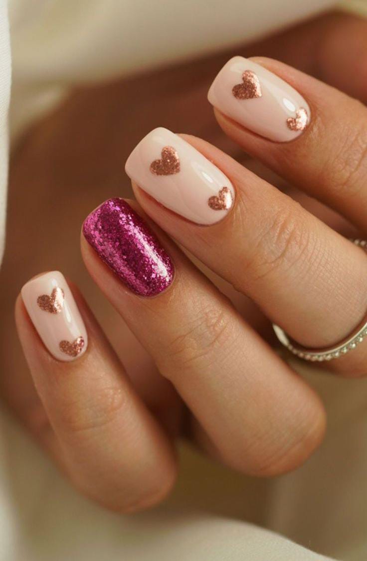 Soft blush-pink nails feature tiny metallic heart accents for a subtle romantic touch. A single glitter accent nail adds gentle sparkle without overpowering the Valentine’s look.