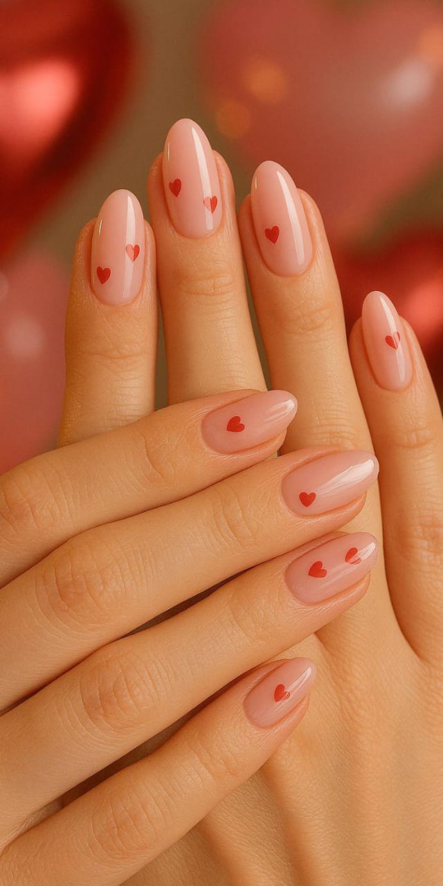 Soft nude nails are decorated with tiny red hearts along the tips for a delicate finish. The look is simple, sweet, and effortlessly romantic Valentines.