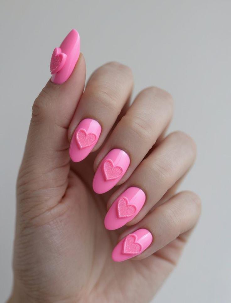 Bright pink nails are kept minimal with raised heart accents for a cute statement. The glossy finish and simple Valentines design make it bold yet clean.