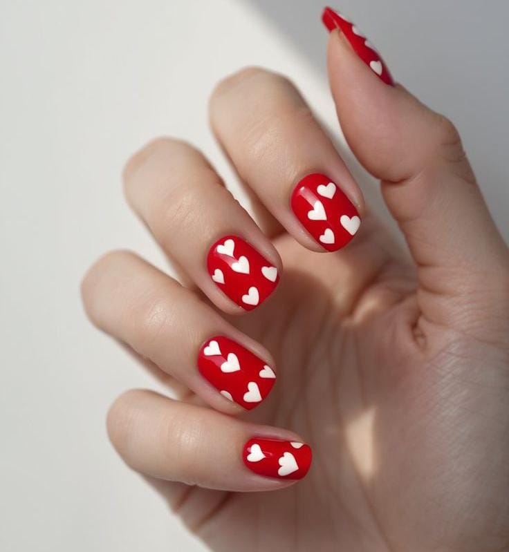 A classic red base is decorated with tiny white hearts scattered lightly across the nails. The look is fun, festive, and perfectly balanced with a minimalist Valentine’s vibe.