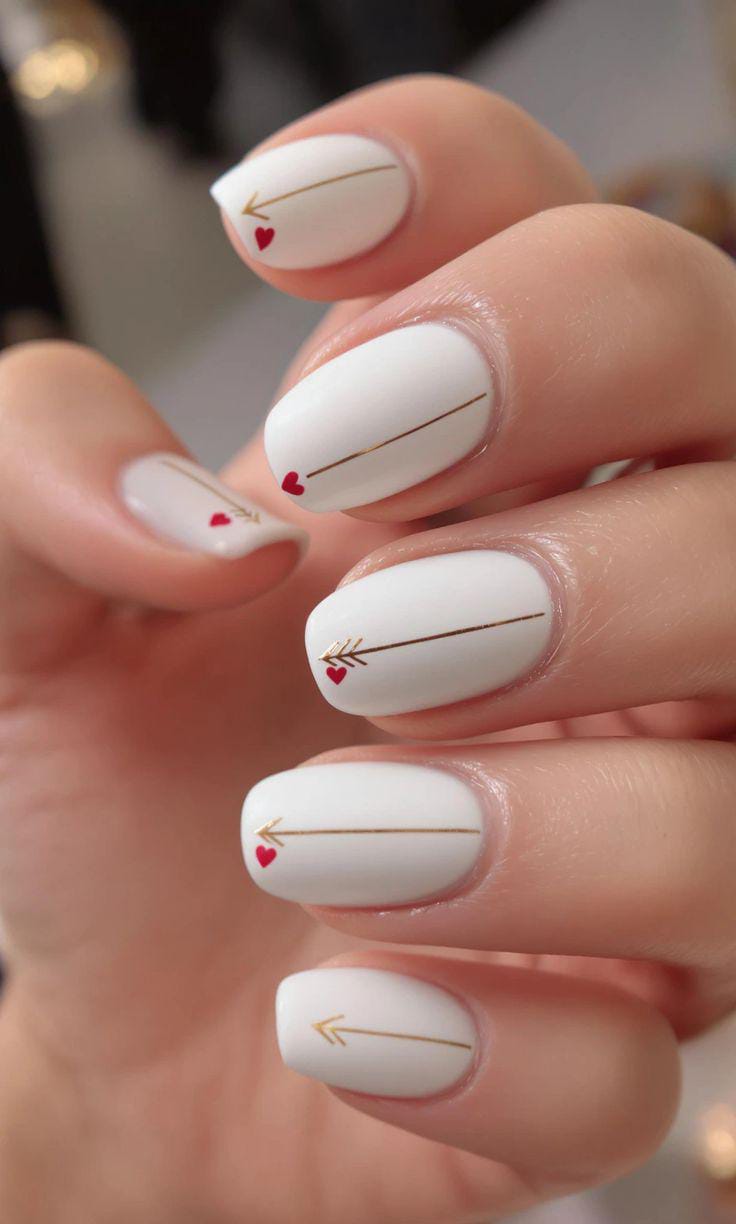 Soft white nails feature thin gold arrow lines with tiny red hearts for a clean, romantic look. The design feels modern, minimal, and perfect for understated Valentine vibes.