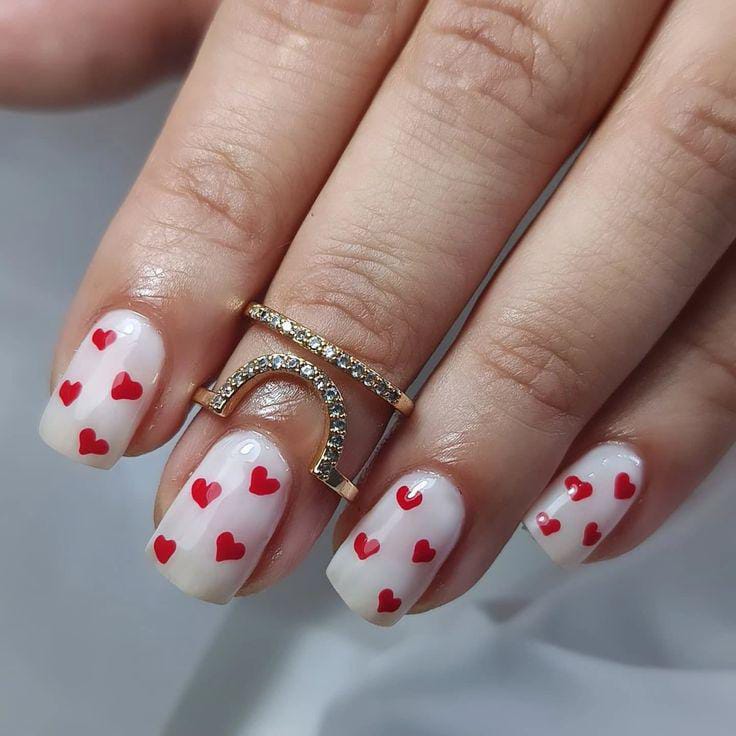 Milky nude nails are scattered with small red hearts for a light and airy Valentine design. The overall vibe is cute, soft, and effortlessly charming.