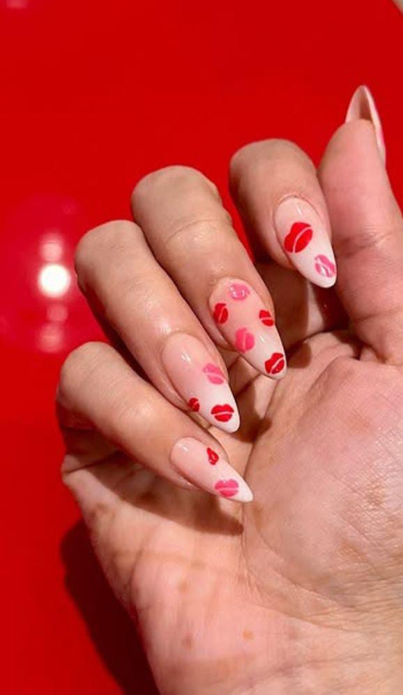 Neutral nude ombre nails are accented with small red and pink kiss prints. The look is flirty, fun Valentine, and still clean enough to stay minimal.
