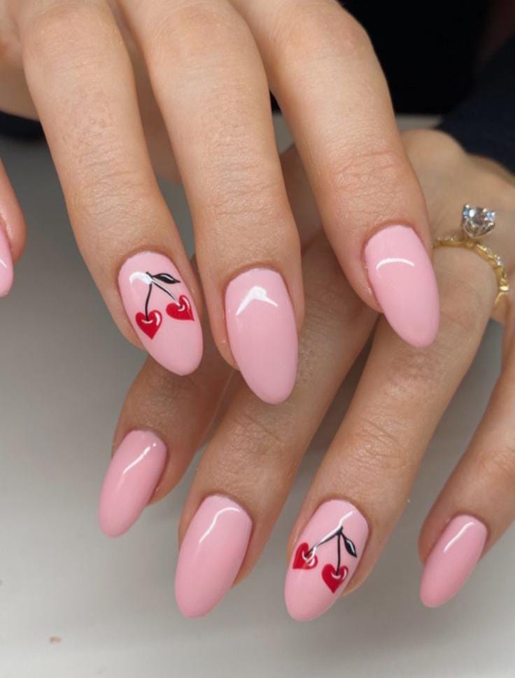 Glossy pastel pink nails feature small cherry-inspired heart details on accent nails. The design feels fresh, feminine, and subtly festive for minimal Valentine’s Day.