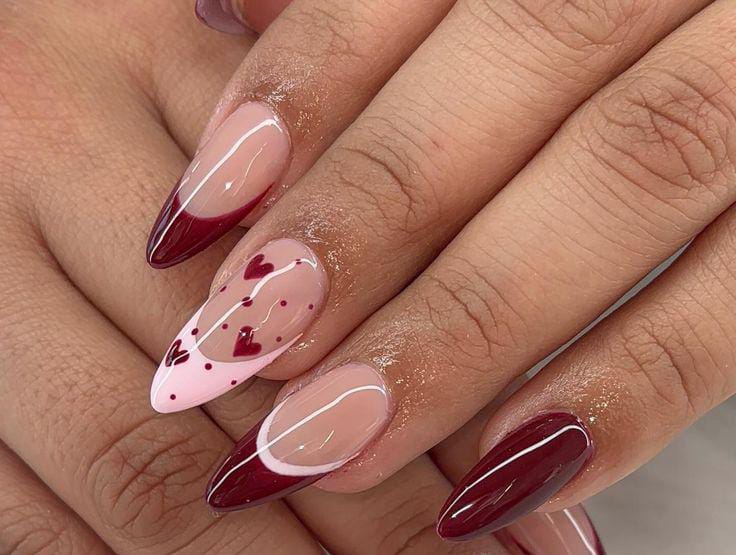This design mixes soft nude and pink bases with deep burgundy tips and tiny heart details. It feels minimal, romantic, and cute Valentine without being too busy.