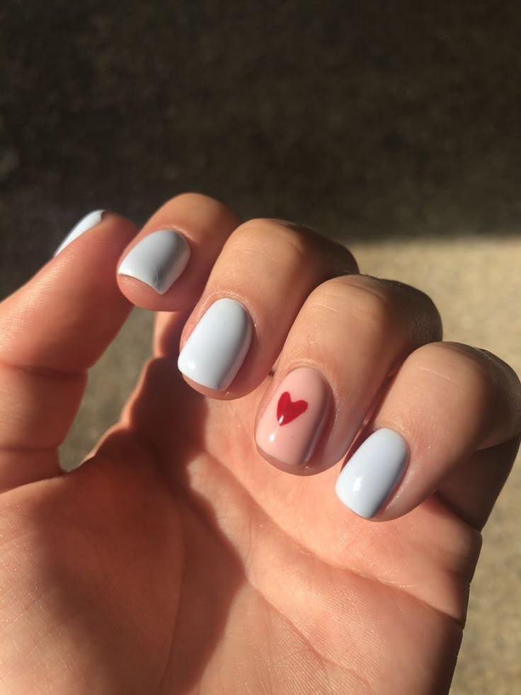 Light blue nails are paired with a nude accent nail featuring a small red heart. The look is clean, calm, and subtly, minimal Valentine-themed.