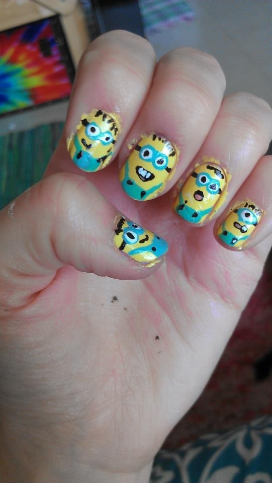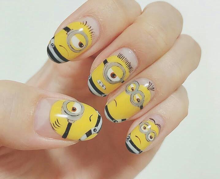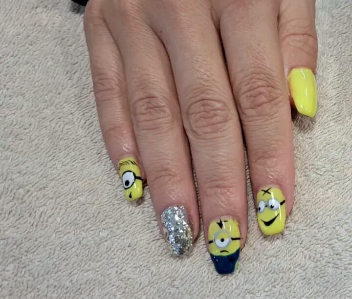 Glossy yellow nails with Minion characters painted across a few fingers, creating a fun squad effect.