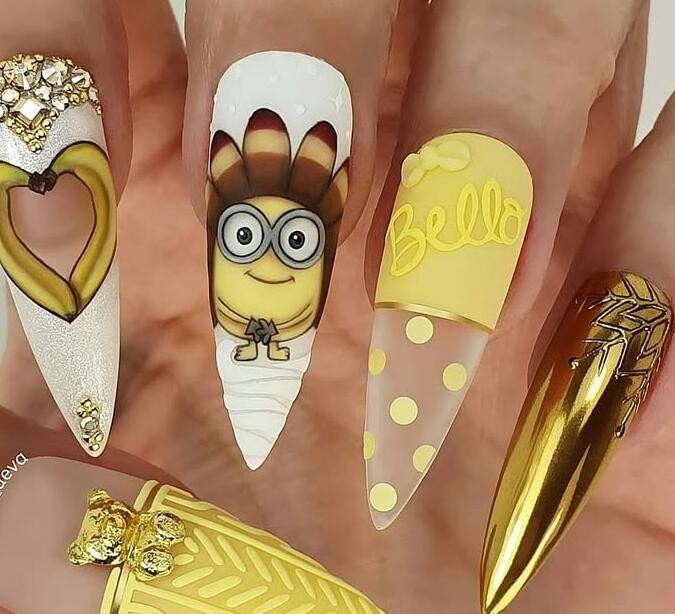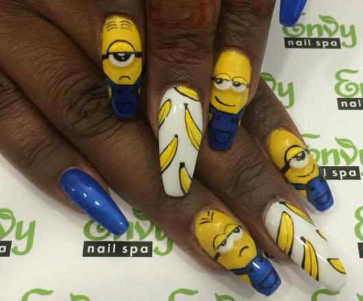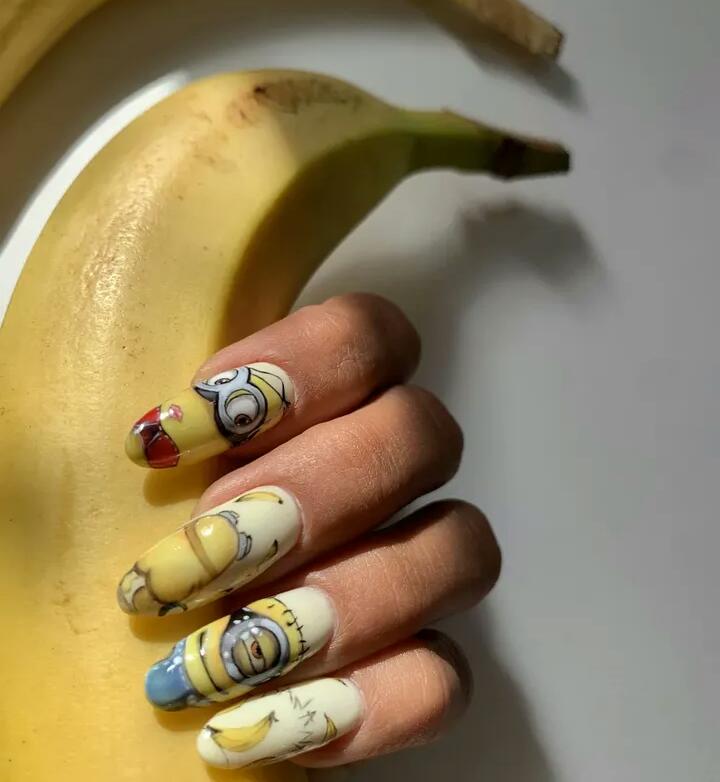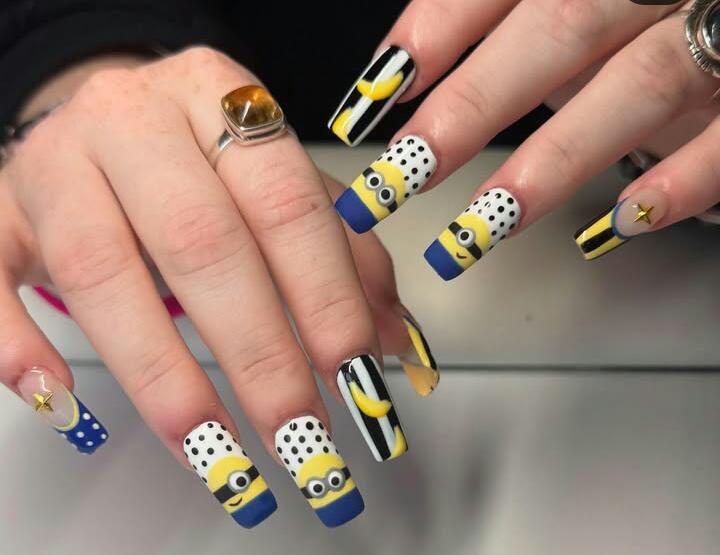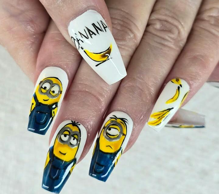 Long nails covered in detailed Minion faces and bananas, giving a lively and cheeky look.
