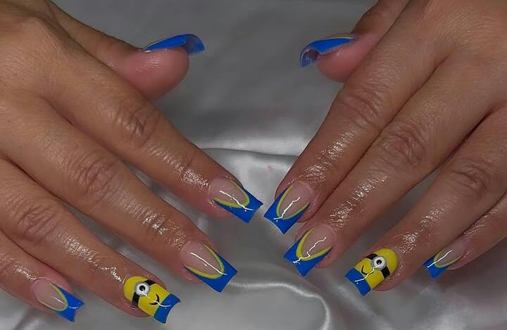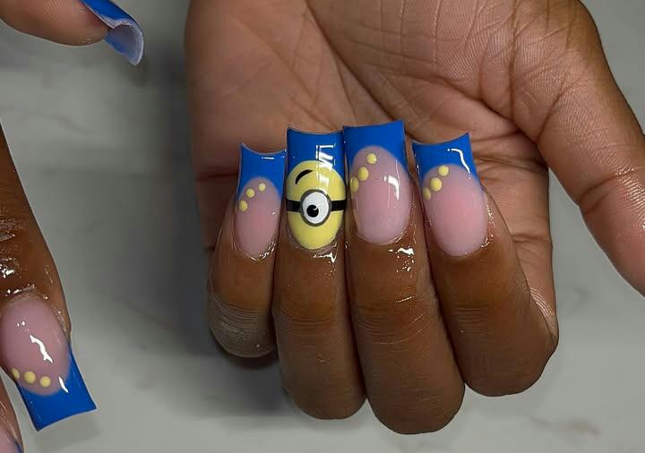 Glossy blue French tips with a big-eyed Minion peeking out in the center, keeping the look bold and cheeky.
