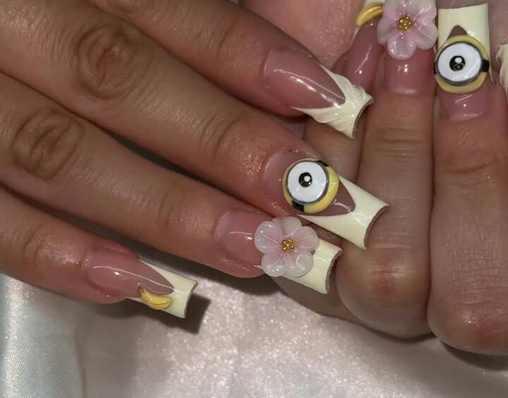 Soft nude nails paired with creamy white tips, decorated with 3D flowers and subtle Minion eyes for a quirky yet feminine touch.