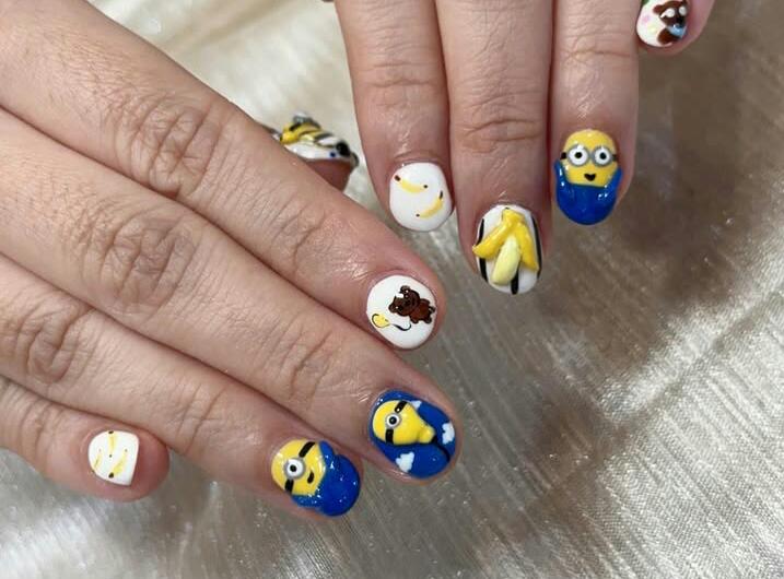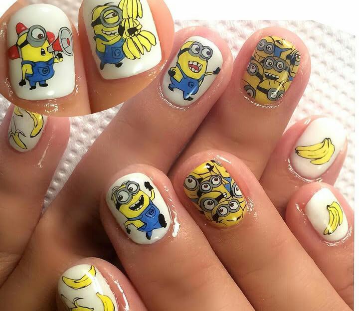 White nails showcasing detailed Minion faces and banana illustrations, creating a lively, animated look with a crisp base.