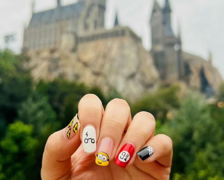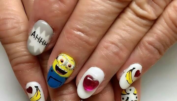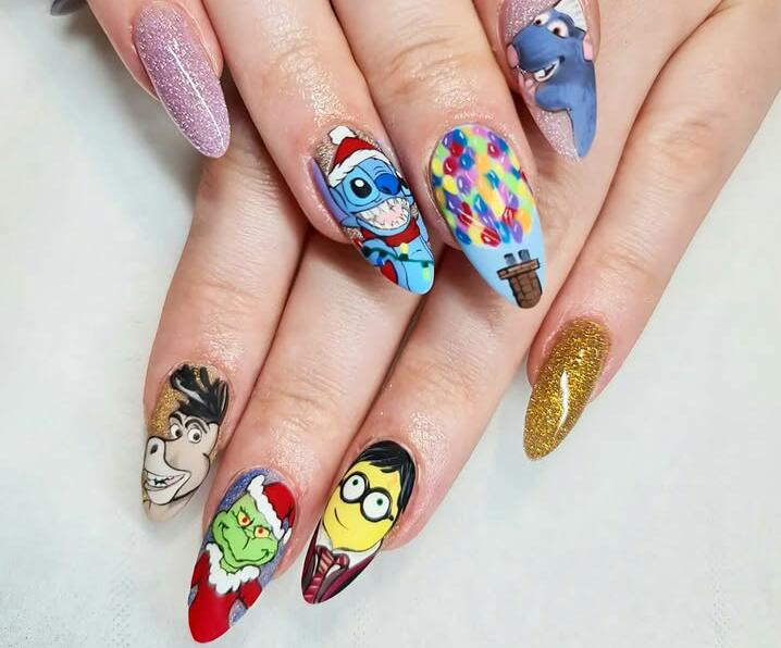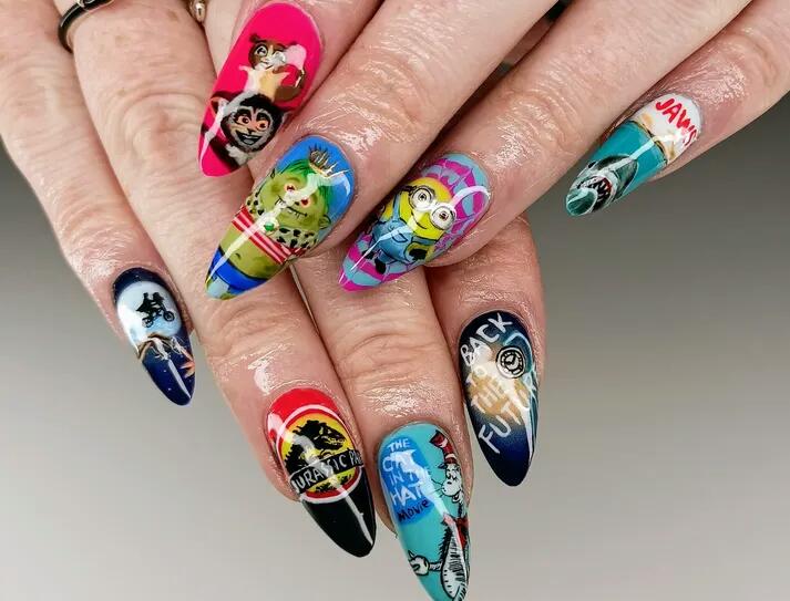 Bright and bold nails mixing minions with iconic movie art, creating a colorful cinematic collage.