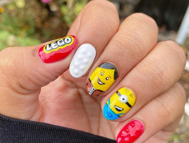 A vibrant mix of red, white, and yellow nails featuring both LEGO and Minion characters for a fun mash-up design.