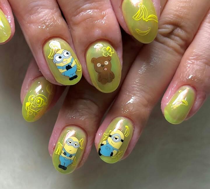 Soft lime green nails decorated with multiple Minions, bananas, and a teddy bear, creating a lively cartoon-inspired style.
