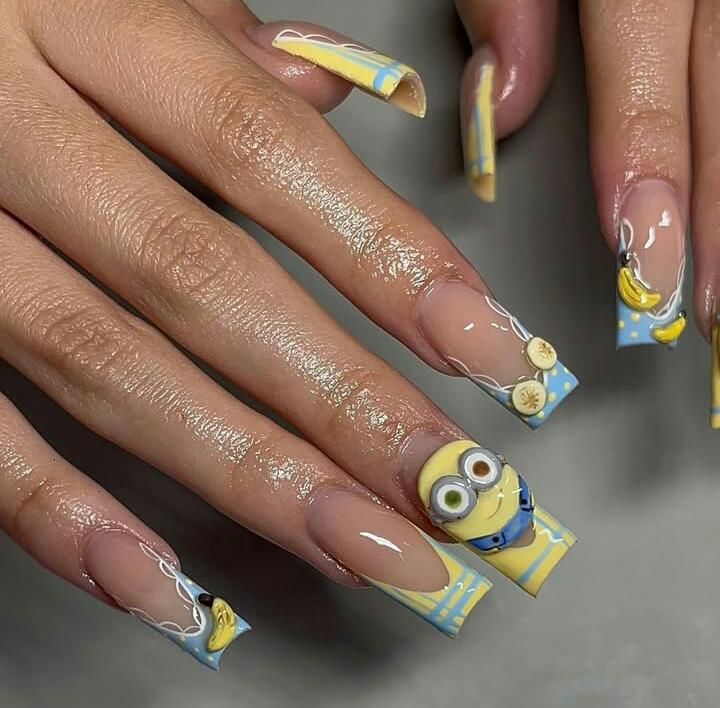 Long square nails with pastel blue and yellow accents, bananas, and a standout 3D-style Minion face for a playful statement look.