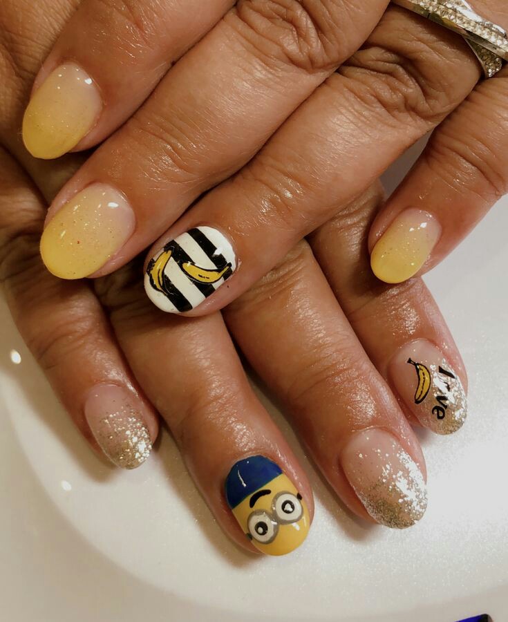 Bright yellow ombré nails mixed with fun minion faces, banana art, and glitter tips for a playful and cheeky vibe.