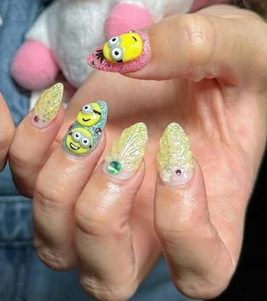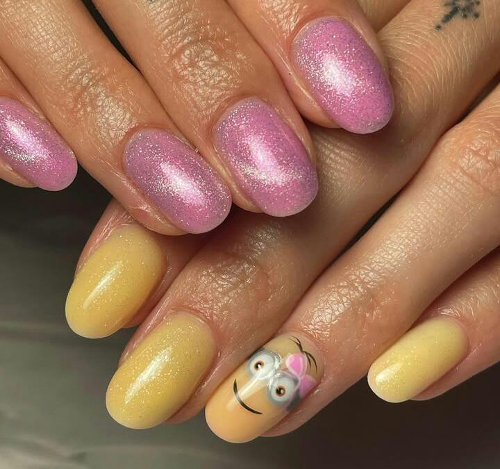 A mix of soft shimmery yellow and pink nails, highlighted with a cute girly minion character accent for a sweet, lighthearted look.