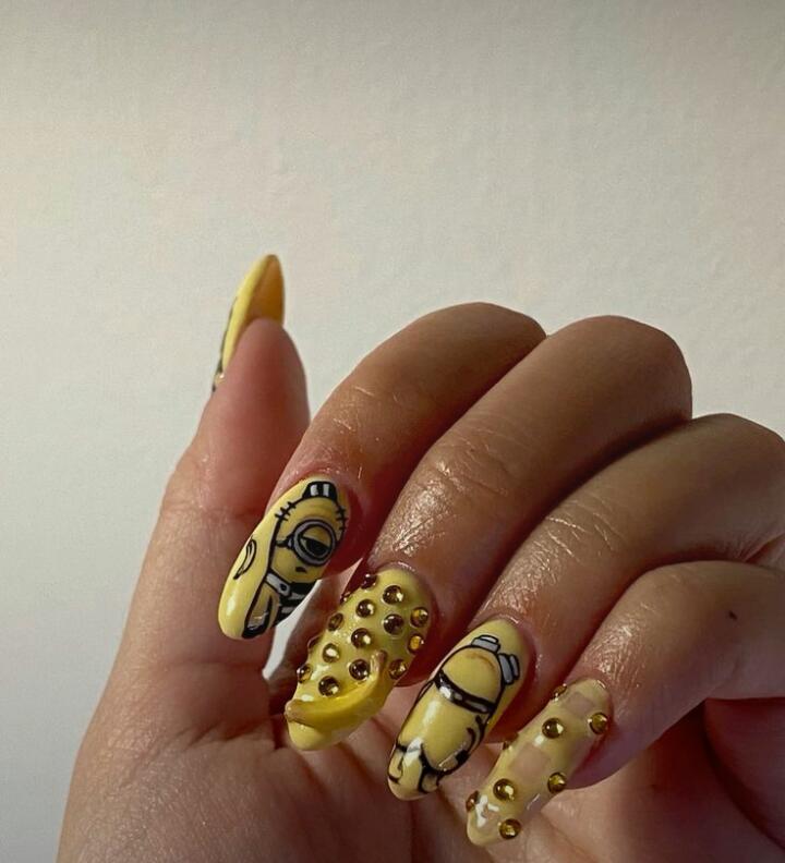 Bold yellow nails with detailed minion art and 3D golden studs, giving a loud, fun, and statement-making style.