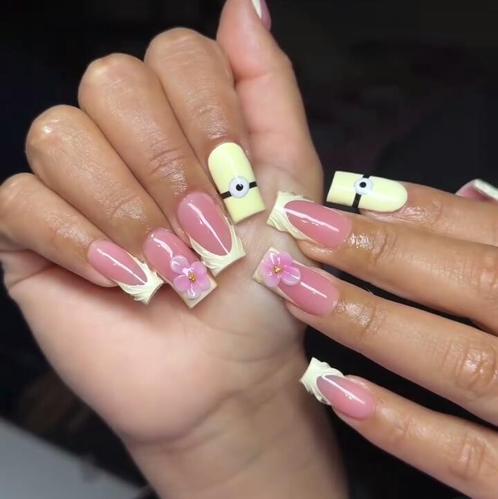 A creative twist on a French manicure with pale pink nails, floral accents, and subtle minion-inspired tips for a cute yet chic design.