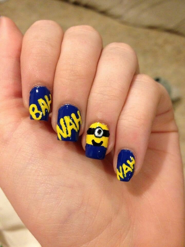 Bold blue nails with yellow “BAH” and “NAH” lettering paired with a classic one-eyed Minion accent nail for a fun, comic style.