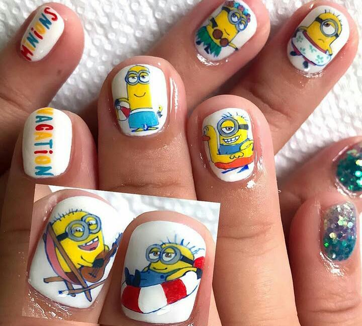 White nails decorated with colorful Minion characters in fun summer outfits, giving a lighthearted holiday feel.