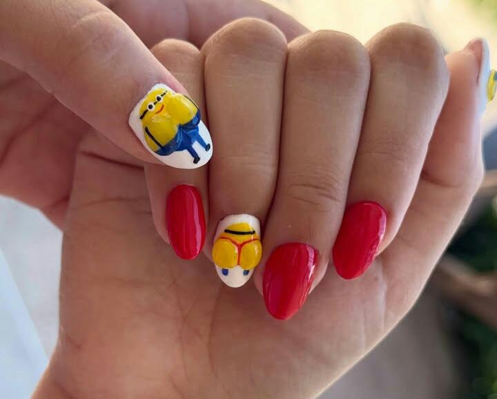 Bright red nails paired with fun Minion art on accent nails, mixing bold color with a playful cartoon vibe.