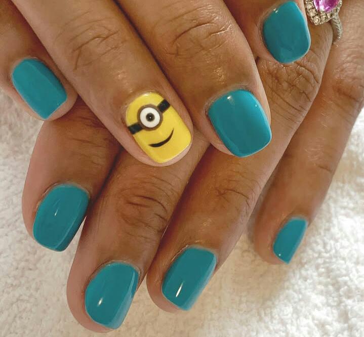 A fresh turquoise manicure with a single Minion face accent for a cute and quirky twist.