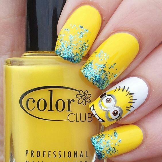 Cheerful yellow nails with glitter tips and one detailed Minion accent, blending sparkle with character art.