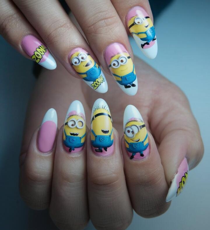 Bright pink and white almond nails decorated with cheerful Minion decals, giving a bold and animated comic vibe.