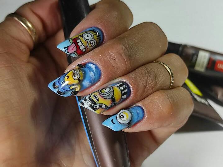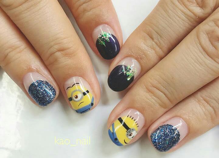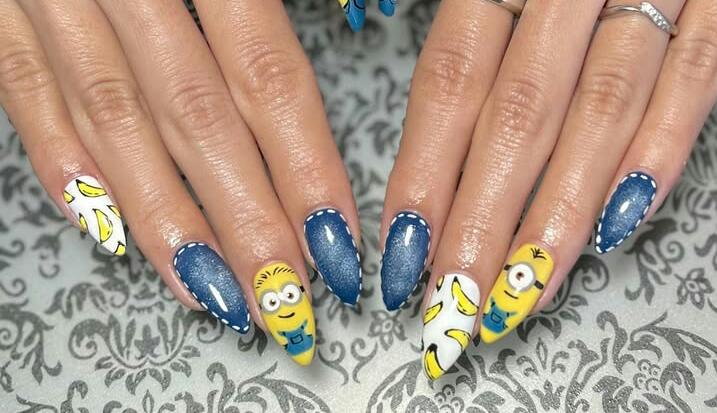A fun mix of sparkly blue, dark polish, and Minion faces, blending playful characters with a touch of glam.