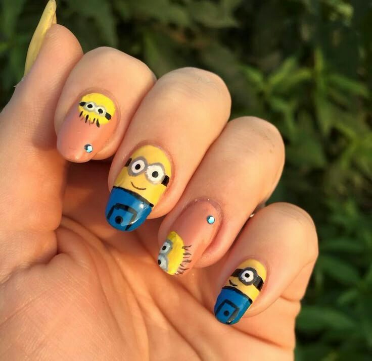 Short nails with hand-painted Minions, accented by tiny rhinestones for a subtle sparkle.