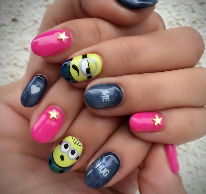 Bright pink and navy nails with stars, hearts, and adorable Minion faces for a fun, youthful design.