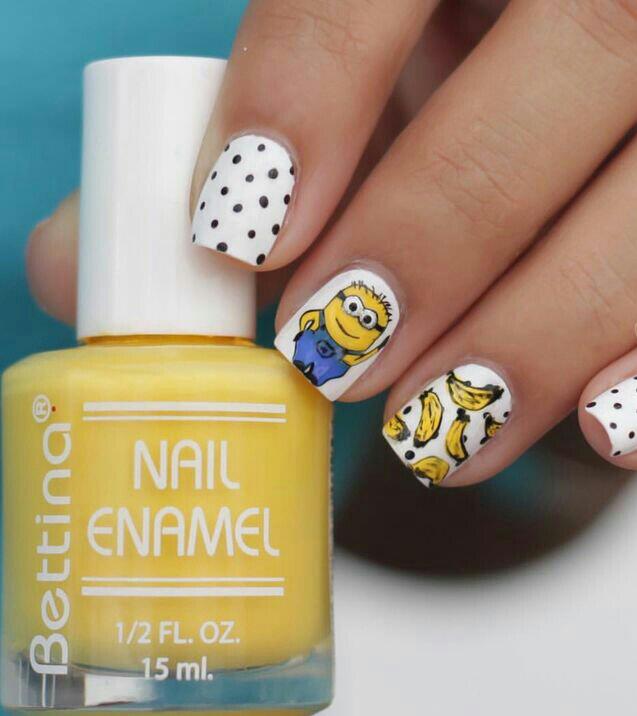 White nails with black polka dots, a minion character, and a banana print for a quirky, cartoon-inspired look.