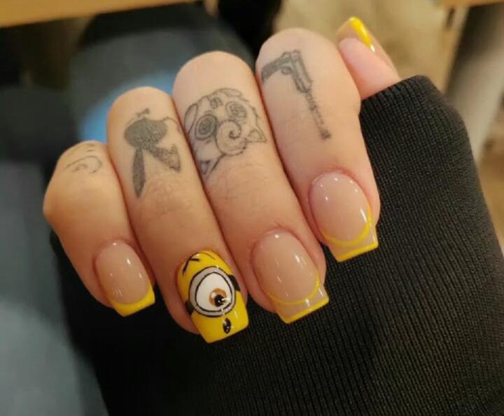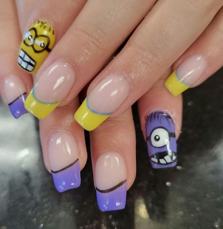 A twist on French tips using yellow and purple ends, paired with detailed minion characters for a funky and stylish vibe.