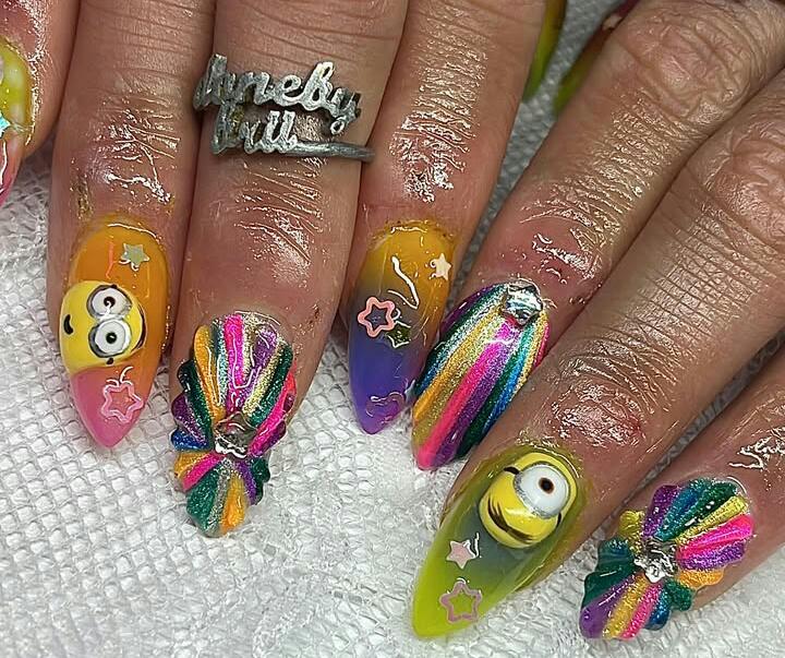 Bright, rainbow-colored nails with 3D effects and minion accents for a loud, eye-catching, and party-ready look.