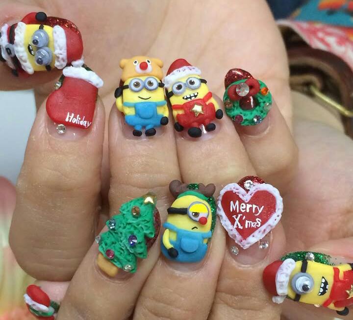 3D holiday-themed Minions in Santa hats, reindeer antlers, and Christmas details, creating a bold and festive statement look.