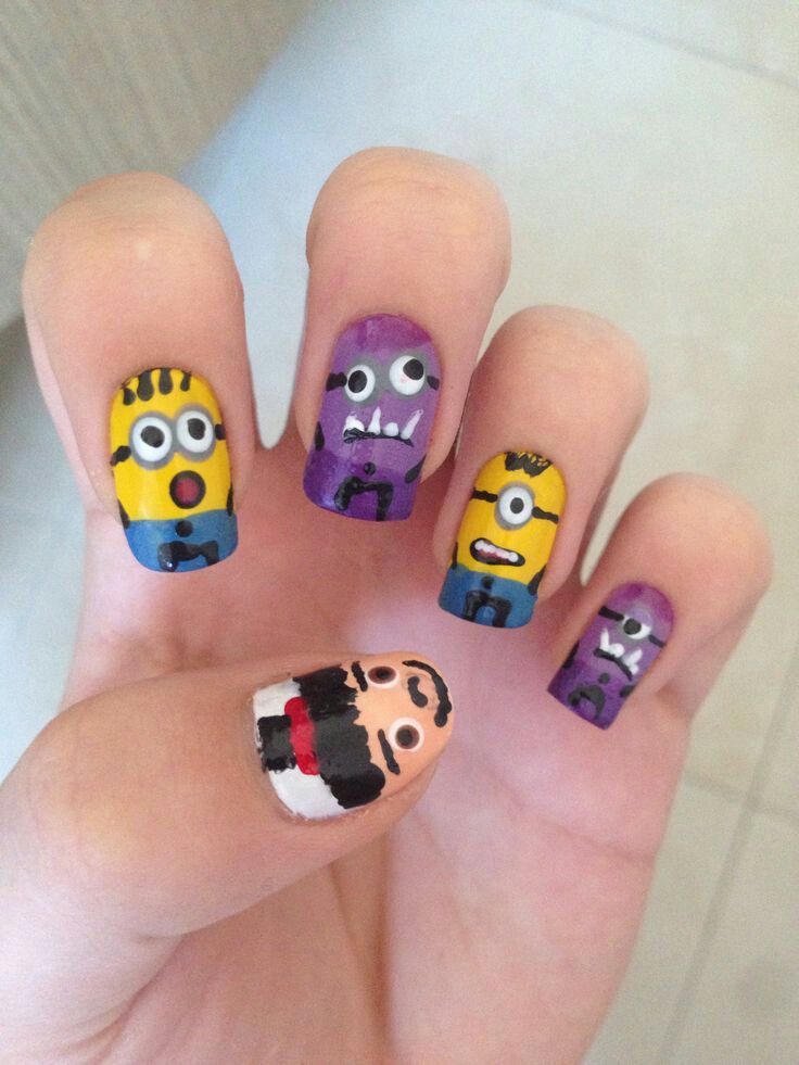 Yellow and purple nails featuring expressive Minions and their mischievous alter-egos for a quirky, cartoonish style.