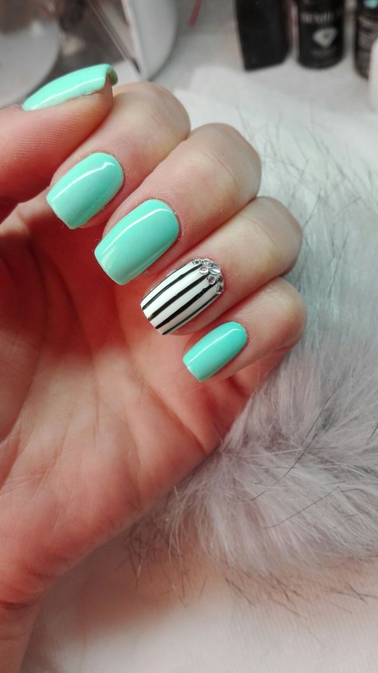 A smooth, glossy mint green takes center stage with a simple, clean finish and subtle rhinestone detail. This design feels airy, effortless, and perfect for a fresh spring refresh.