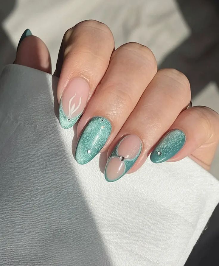Mint green glitter French tips are combined with nude bases and tiny rhinestone accents. The vibe is fresh yet glamorous, adding a bit of sparkle to a spring-ready look.
