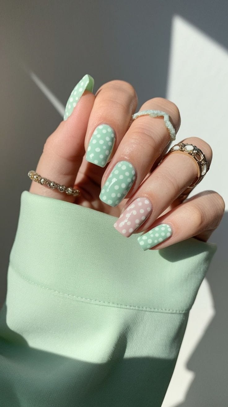 Soft mint green nails and a soft pink accent nail with playful white polka dots create a fresh, retro-inspired spring look. The mix of mint and blush tones feels sweet, light, and effortlessly cheerful.
