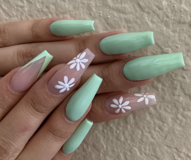 Long mint green coffin nails paired with a single french tip and a nude base with simple white daisies give off a clean, floral spring vibe. The design feels airy, feminine, and perfect for warm-weather days.