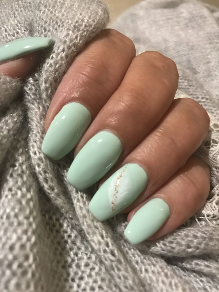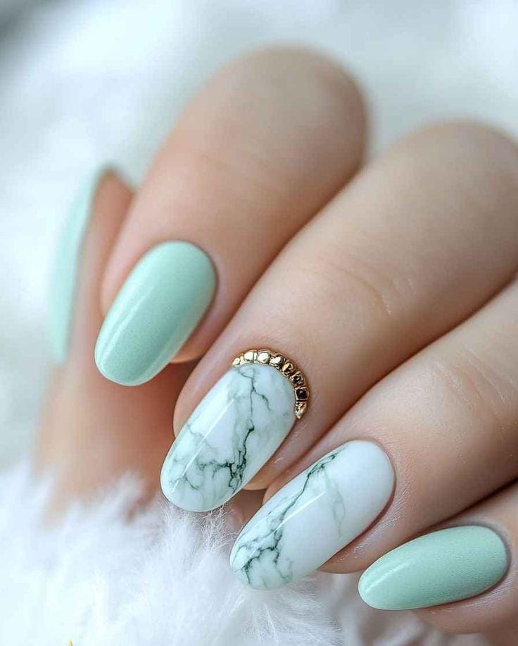 This design blends creamy white marble accents with smooth mint green nails for a polished, elegant look. The subtle gold detail adds a soft touch of luxury without overpowering the fresh palette.